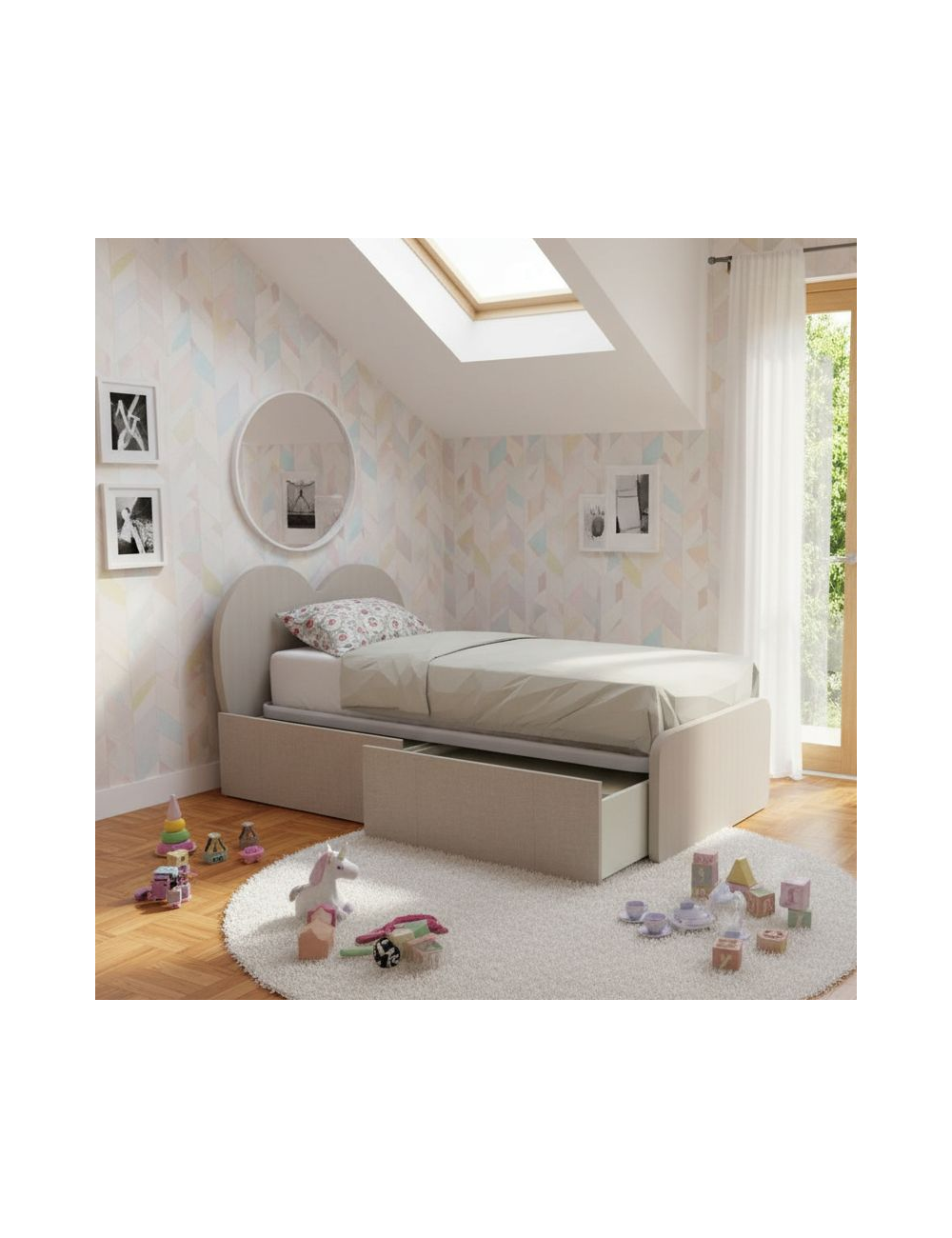 CUPIDOC - Letto cameretta a cuore singolo 80x190 con cassettoni estraibili e testata personalizzabile.Rete inclusa