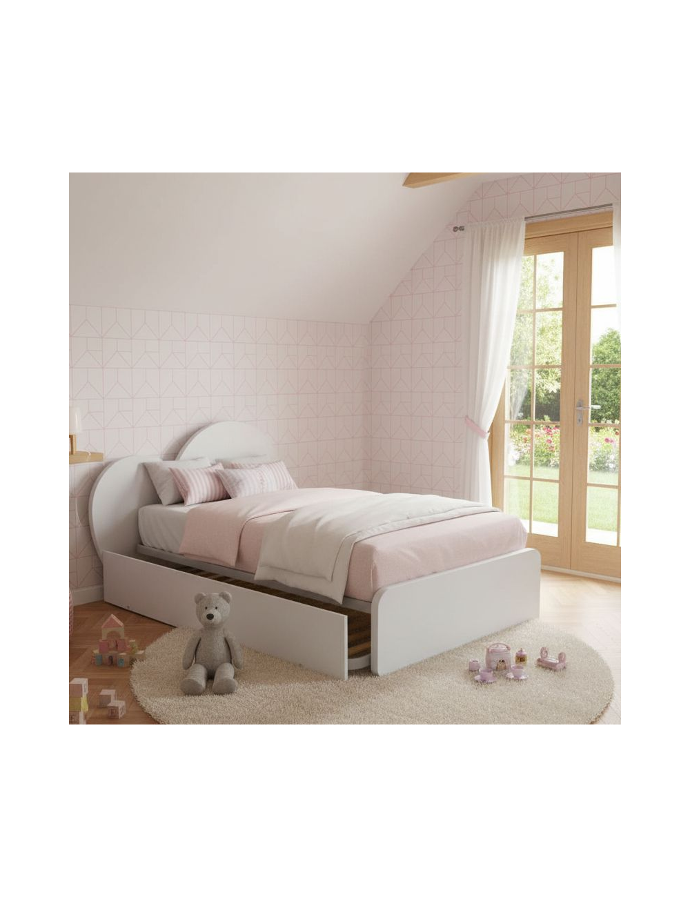 Dieses Doppelbett (120x190 cm) ist eine perfekte Kombination aus bezauberndem Design und intelligenter Funktionalität >, Entwickelt, um den Bedürfnissen der Jüngsten gerecht zu werden und den Platz in den Schlafzimmern zu optimieren.