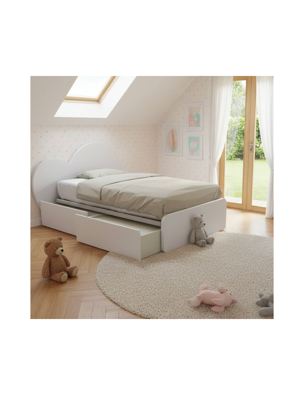 Die zwei geräumigen, unabhängigen Schubladen, ausgestattet mit Rollen und einem staubdichten Verkabelungssystem, bieten ausreichend Platz für die Aufbewahrung von Bettwäsche, Spielen und allem, was Sie in Ordnung halten möchten. Der mitgelieferte Lattenrost aus Buchenholz mit einer Belastbarkeit von 120 kg garantiert eine optimale Unterstützung der Matratze (empfohlen 120x190 cm).