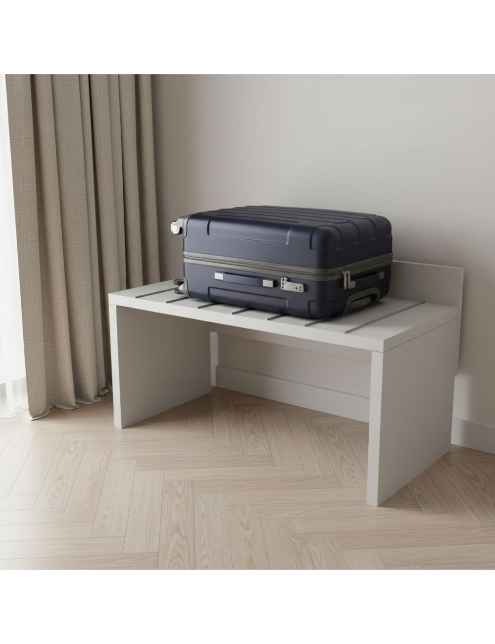 Dieser aus hochwertigen Materialien gefertigte Kofferständer verfügt über eine dicke selbsttragende Struktur (30 mm für die weiße Farbe, 38 mm für die anderen Farben), die Stabilität und Robustheit garantiert. Die an der Struktur befestigte 18-mm-Bodenplatte schützt die Wände vor Flecken und Kratzern durch Koffer und Taschen.