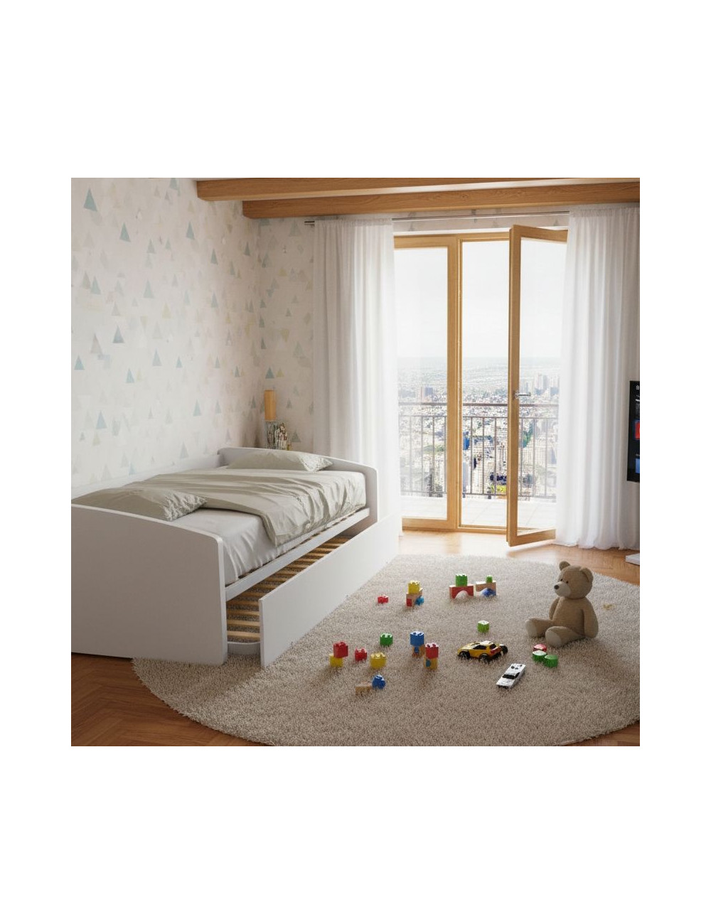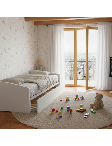 Der Ausziehmechanismus ist einfach und intuitiv: Ziehen Sie einfach das untere Bett heraus und heben Sie es mit den praktischen Schnappbeinen an. Beide Bettgestelle aus Stahl mit einem 40x30-Profil und 12 Buchenholzleisten garantieren optimalen Halt und eine lange Lebensdauer. Das obere Netz ist ebenfalls strukturell und bietet mehr Stabilität und Widerstandsfähigkeit.