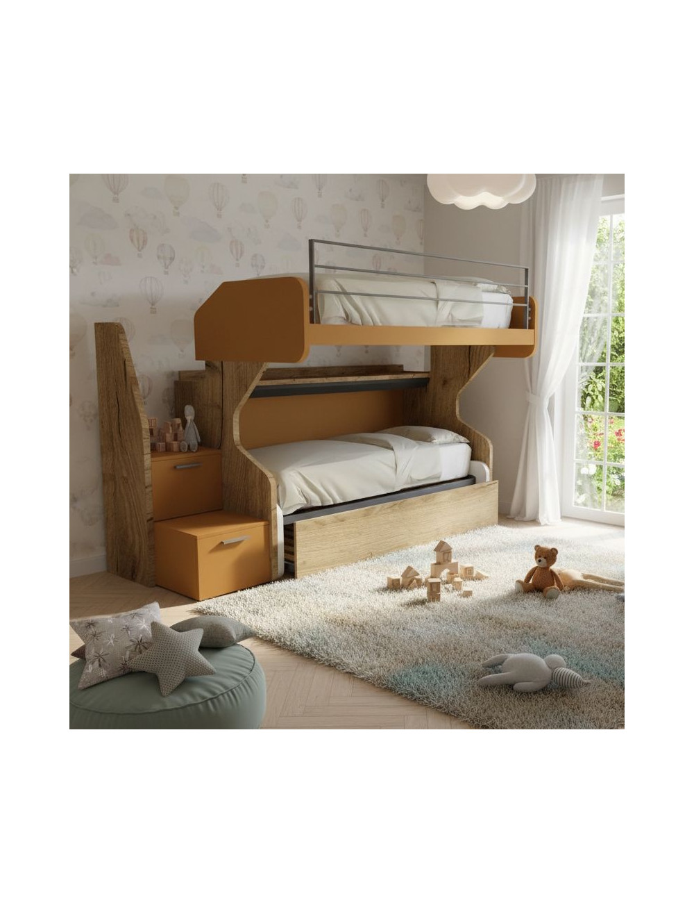 Gracias a la plataforma deslizante, acceder a la cama superior es un juego de niños. El pasillo oculto te permite hacer la cama sin esfuerzo, mientras que el escalón con dos cajones espaciosos te brinda espacio adicional para organizar libros, juegos y ropa. La cama inferior, independiente y equipada con ruedas direccionales, se puede mover libremente por la habitación, mientras que la tercera cama extraíble se transforma en un instante en una cómoda cama doble para acoger a amigos y familiares.