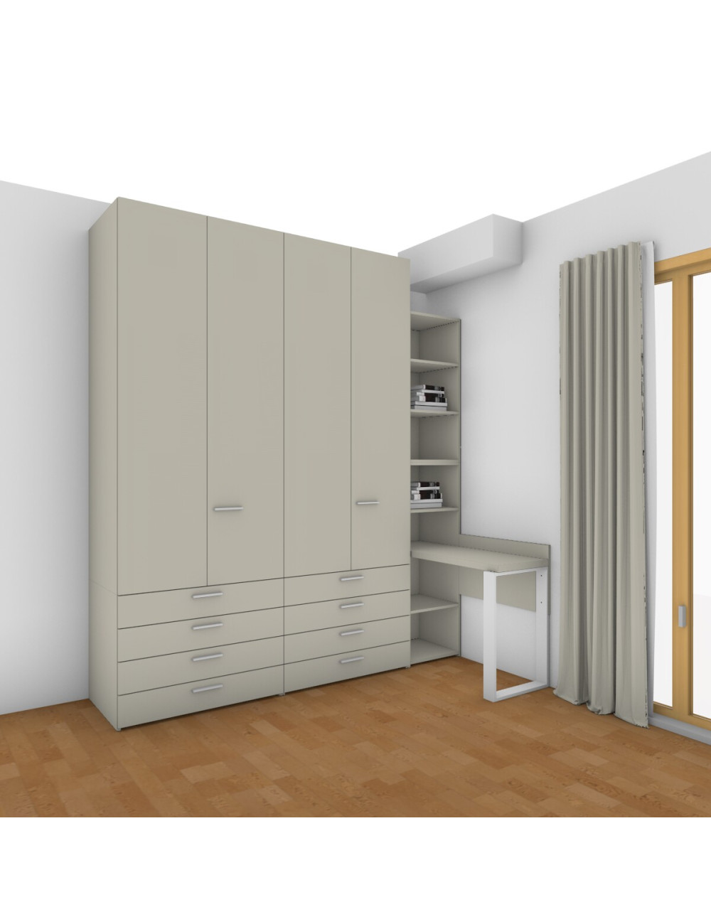 Letto singolo 80x190 con letto estraibile indipendente e sollevabile 80x190 , dal momento in cui si alza andrà a formare un perfetto matrimoniale con il letto principale. Elemento retro letto ad uso comodino, profondo come la testata letto. Armadiatura h 257,8 cm con 4 cassetti larghezza 90 h 16 cm con chiusura rallentata. Elemento a semi ponte che abbraccia il letto, con libreria ad L con profondità ridotta a L .Angolo studio larghezza 135 cm con libreria. Finitura bianco e rovere rock con maniglia cod71.Materassi 80x190 h 18 cm. Sedia non inclusa. Montaggio non incluso
