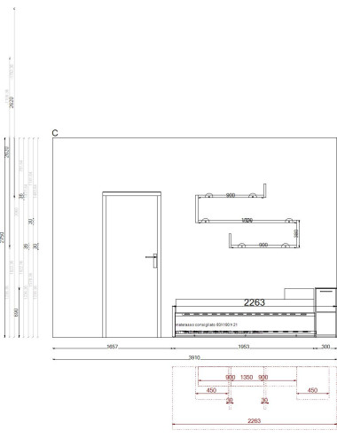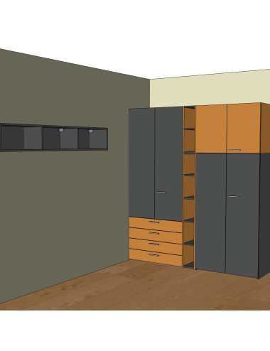 Letto singolo 80x190 con letto estraibile indipendente e sollevabile 80x190 , dal momento in cui si alza andrà a formare un perfetto matrimoniale con il letto principale. Elemento retro letto ad uso comodino, profondo come la testata letto. Armadiatura h 257,8 cm con 4 cassetti larghezza 90 h 16 cm con chiusura rallentata. Elemento a semi ponte che abbraccia il letto, con libreria ad L con profondità ridotta a L .Angolo studio larghezza 135 cm con libreria. Finitura bianco e rovere rock con maniglia cod71.Materassi 80x190 h 18 cm. Sedia non inclusa. Montaggio non incluso_5.jpeg)