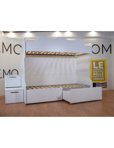 SMARTB está disponible en una amplia gama de colores, desde tonos neutros de blanco y roble roca, hasta combinaciones más vivas como blanco y rojo o roble y azufre. Además, podrás elegir entre diferentes configuraciones: con cajones extraíbles cerrados mediante tapa, o con una tercera cama extraíble para crear una cama de matrimonio cuando sea necesario.