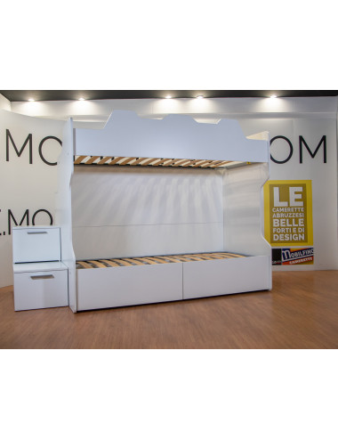 La escalera lateral, equipada con dos grandes escalones y cajones con cierre suave, ofrece un acceso seguro y cómodo a la cama superior, transformándose al mismo tiempo en un práctico contenedor para juegos, libros y ropa. Colocable tanto a derecha como a izquierda, se adapta perfectamente a las necesidades de cada dormitorio.