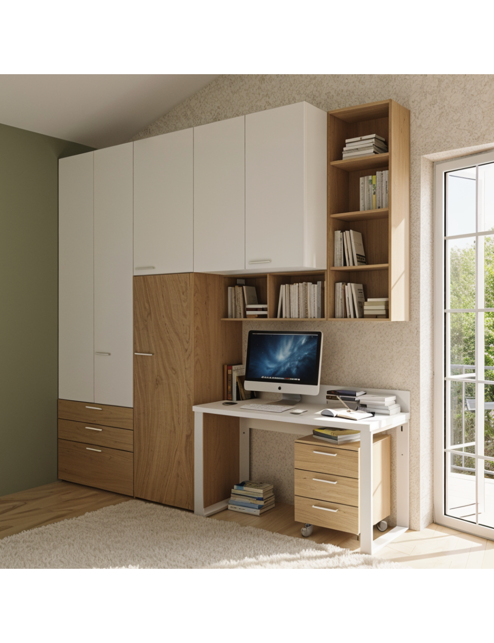 Lit complet avec rangement modèle 964C avec tiroirs câblés avec couvercle et indépendants. Élément de rangement arrière avec deux trappes. Bureau largeur 1350 avec deux pieds laqués blanc et dossier arrière. Armoire largeur 900 avec un tiroir h 320 et deux tiroirs h 160, hauteur totale du meuble 2578, armoire 600 avec deux portes et tubes, élément suspendu au-dessus du bureau 900 et bibliothèque ouverte. Couleurs blanc et chêne.
