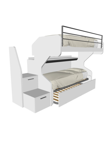 Grâce à la plateforme coulissante, accéder au lit supérieur est un jeu d'enfant. La passerelle cachée vous permet de faire le lit sans effort, tandis que la marche avec deux tiroirs spacieux vous offre un espace supplémentaire pour organiser des livres, des jeux et des vêtements. Le lit inférieur, indépendant et équipé de roulettes directionnelles, peut être déplacé librement dans la pièce, tandis que le troisième lit extractible se transforme en un instant en un lit double confortable pour accueillir amis et parents.
