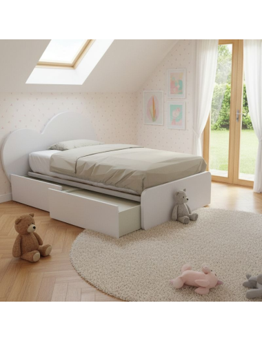 Les deux tiroirs indépendants spacieux, équipés de roulettes et d'un système de câblage anti-poussière, offrent suffisamment d'espace pour ranger le linge, les jeux et tout ce que vous souhaitez garder en ordre. Le sommier à lattes en hêtre inclus, d'une capacité de 120 kg, garantit un maintien optimal du matelas (120x190 cm conseillé).