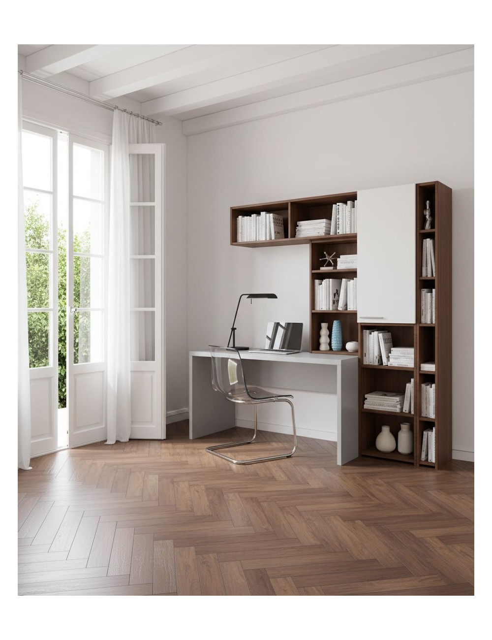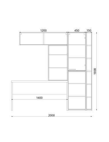 Composizione angolo studio formato da scrivania L.140 cm P.58,2 cm, vano chiuso con anta ed elementi a giorno/librerie. L.tot 200 cm H.tot 193,8 cm