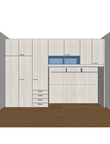 Armadiatura a ponte formata da elemento L.90cm, elemento L.60cm con cassettiera sottostante con 4 cassetti a chiusura rallentata, elementi sopra telaio L. tot 210cm con libreria a giorno, fianco e pannelli di fondo con mensola. DIMENSIONI TOTALI L.375,8cm H.257,8cm. Colori rovere rock e avio. Maniglie codi.71. Letto e materasso esclusi.