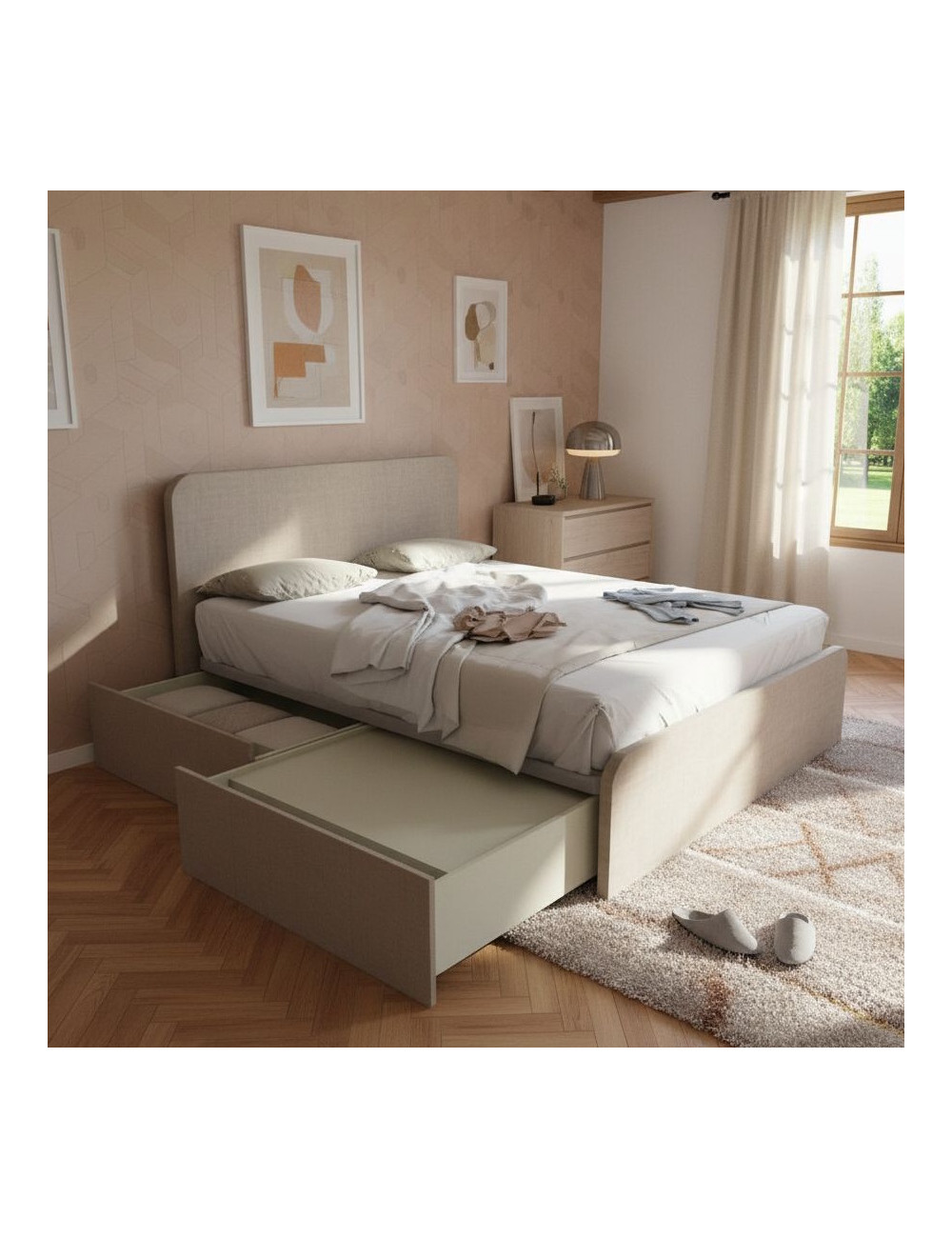 Un letto che unisce design contemporaneo, praticità e qualità artigianale italiana Questo letto matrimoniale contenitore è la soluzione ideale per chi cerca un arredo elegante e funzionale per la propria camera da letto. La struttura robusta in acciaio e le doghe in legno di faggio assicurano un supporto ottimale per il materasso, garantendo un riposo confortevole e rigenerante. I due ampi cassettoni, indipendenti e ad estrazione totale, offrono uno spazio contenitivo generoso per riporre biancheria da letto, coperte, cuscini e tutto ciò che desideri tenere a portata di mano ma lontano dalla vista. La testata sagomata, alta 105 cm, dona un tocco di raffinatezza e personalità all'ambiente.