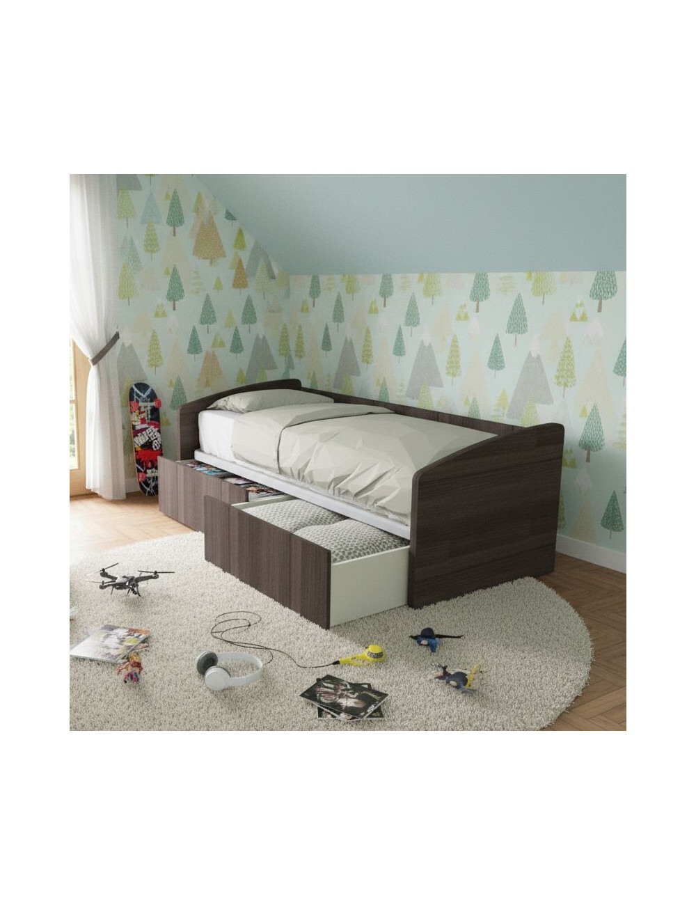 Non lasciarti ingannare dal suo aspetto elegante e moderno: questo divano letto è un vero e proprio concentrato di funzionalità. Di giorno, è un comodo divano dove rilassarti, leggere o guardare la TV. Di notte, si trasforma in un letto singolo accogliente, perfetto per ospitare amici e parenti. E grazie ai due ampi cassettoni estraibili, avrai tutto lo spazio necessario per riporre biancheria da letto, coperte, cuscini e molto altro ancora.